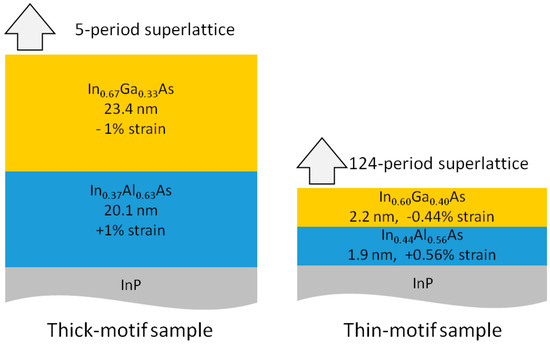 In1−xGaxAs/In1−yAlyAs strained SL samples with the target characteristics illustrated in Figure 1 were grown on (001)-oriented InP substrates. The sample designs included a thick (43.5 nm) motif SL composed of five repetitions of In0.37Al0.63As (20.1 nm)/In0.67Ga0.33As (23.4 nm) with 1% tensile/compressive strain relative to the InP substrate, nominally and respectively, and a thin (4.1 nm)-motif SL composed of 124 repetitions of In0.44Al0.56As (1.9 nm)/In0.6Ga0.4As (2.2 nm) nominally strained +0.56%/−0.47% relative to the substrate, respectively.