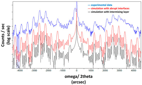 High-resolution X-ray diffraction (HRXRD) (004) ω-2θ scan for the thick-motif SL with simulations: (red) abrupt SL interfaces and (black) SL with a 1 nm thick constant composition intermixing layer. All scans are offset vertically for clarity.