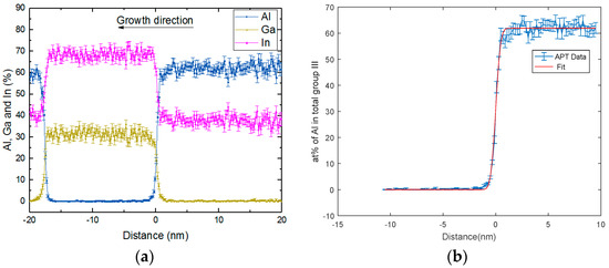 (a) Proxigram concentration profiles for the group III elements perpendicular to the interface in the thick-motif SL. Error bars represent the count of the statistical precision of the atom probe data; (b) Measured Al concentration profile, together with a best-fit semi-infinite solid solution to Fick’s second law of diffusion applied to the InGaAs–InAlAs interface.