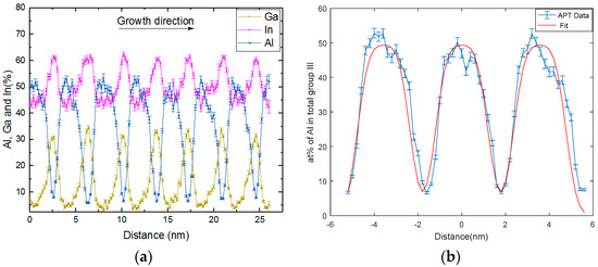 (a): Proxigram for thin-motif SL showing only group III concentrations. (b) Diffusion length estimation by fitting Fick’s law of diffusion to the Al content profile.