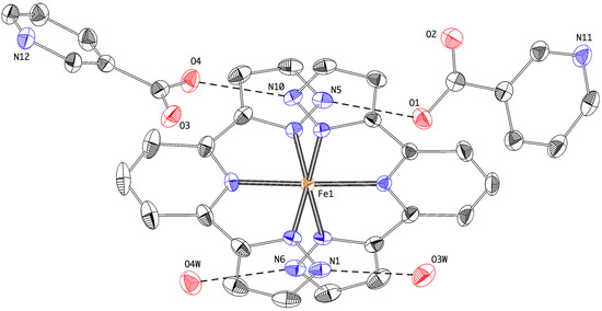 1·4H2O crystallizes in the non-centrosymmetric and polar Pc monoclinic space group (Table 1). The crystal structure contains only one crystallographically independent (Figure 1) Fe(II) centre, Fe1, and two inequivalent anions in the structure. The independent Fe2+ site is located in a general position and is bound to two bpp tridentate ligands in mutual perpendicular orientations. Therefore, the iron(II) coordination environment is the well-known octahedral FeN6 with the highest possible D2d local symmetry of the [Fe(bpp)2]2+ cations. The Fe-N(pyridine) bond distances (mean value ≈ 1.9264(25)) are slightly shorter than those corresponding to the Fe–N(pyrazole) bonds (mean value ≈ 1.964(8)). In any case, the Fe–N bond distances are lower than 2.0 Å, thus revealing a low-spin ground state for the Fe2+ cation, which is the expected stable spin state observed in similar hydrated compounds [37,38,39]. With respect to the second iron coordination sphere, each [Fe(bpp)2]2+ complex is hydrogen-bonded to only two nicotinate anions and two water molecules. The N atoms of the isonicotinate anion do not establish interactions with the bpp ligand and are hydrogen-bonded to crystallization water molecules present in the network.