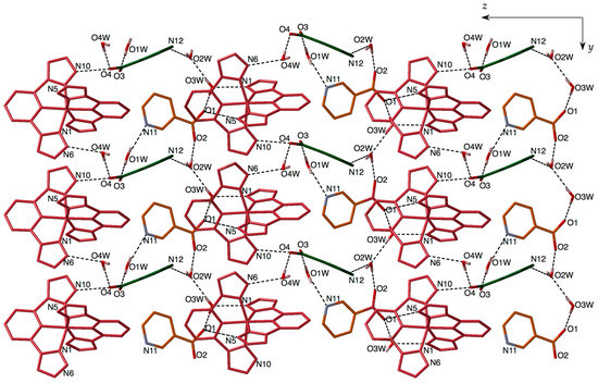 The nicotinate anions and water molecules occupy the space between the [Fe(bpp)2]2+ cationic layers. A view parallel to the sheets (Figure 2) shows the two independent nicotinate anions depicted in different colours. The first one (illustrated in orange in Figure 2) is hydrogen-bonded to three water molecules (O1W, O2W and O3W) and one [Fe(bpp)2]2+ cation (N5). The other nicotinate anion (depicted in green) is also hydrogen-bonded to three water molecules (O1W, O2W and O4W) and one [Fe(bpp)2]2+ cation (N10). Therefore, the common feature is that they are connected to only one Fe2+ centre using one oxygen atom that is simultaneously hydrogen-bonded to one water molecule, the other oxygen atom and the nitrogen of the pyridine unit being engaged in hydrogen bonding with additional water molecules. Both anions alternate in the interlayer space along the y direction. Relevant hydrogen-bonding parameters are gathered in Table S2.