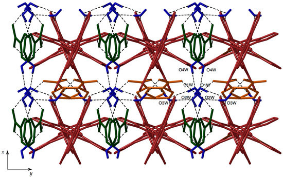 A projection of the crystal packing onto the ab plane (Figure 4) shows the presence of two different types of water molecules: the ones that form the layers through direct hydrogen bonds with the bpp ligands (O3W and O4W), and the ones that fill the voids within the layers (O1W and O2W).