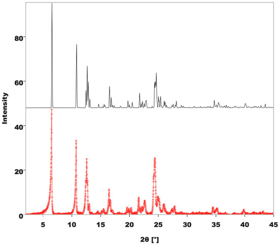 Comparison of the powder diffractogram of 1·4H2O (in red) with the simulation obtained from single crystal data (in black).