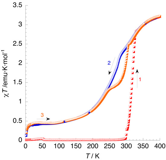 The temperature dependence of the χT product (χ = molar magnetic susceptibility; T = absolute temperature) is shown in Figure 6. At low temperatures, the sample is diamagnetic, as expected for a low-spin ground state for this Fe(II) complex. Above room temperature, χT increases continuously on heating up to 400 K, where it equals 3.21 emu·K·mol−1. This value is the one expected for a high-spin Fe2+ cation per formula (≥3.0 emu·K·mol−1), indicating a complete spin crossover triggered by the dehydration of the sample. Upon cooling, χT decreases continuously and reaches a critical point at 283 K (corresponding to the first transition seen in DSC, cooling mode), where χT = 2.21 emu·K·mol−1 (fraction of high-spin centres γHS ≈ 2/3). Then, it decreases more abruptly until T = 273 K, and then smoothly to reach a plateau below 83 K, where χT = 0.41 emu·K·mol−1 (fraction of high-spin centres γHS ≈ 1/8). Below 15 K, χT decreases sharply due to zero-field splitting effects.