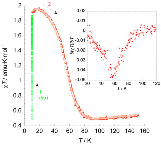 Photomagnetic properties of 1. Curve 1 (green): Irradiation at 10 K. Curve 2 (orange): Thermal variation of χT upon heating at a scan rate of 0.3 K·min−1. The inset shows the first derivative plot of the T(LIESST) curve.