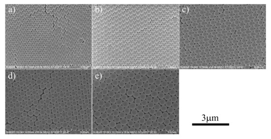 In order to accurately investigate the mechanical properties of silica PC thin films under nanoindentation, high-quality samples were prepared. Note that the PC thin films prepared by flow-induced deposition usually yield a surprisingly strong preference for FCC crystal structure. Characterization of structural features of the PC thin films was conducted to measure the size of microspheres and check a variety of defects of the samples, such as holes, cracks, and pores, which inevitably exist during the preparation process, as shown in Figure 1a–e. Each PC thin film was composed of quite uniformly sized microspheres with size deviation of less than 5%; the diameters of measured microspheres are listed in Table 1. From Figure 1a–e, we can see that the silica microspheres are well-organized in a close-packed arrangement with long-range order.
