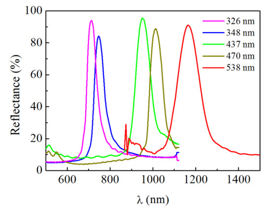 The optical reflectance spectra of silica PCs are shown in Figure 2. It is obvious that the reflecting peaks of the PCs were located at 712.6 nm, 757.0 nm, 941.2 nm, 1011.1 nm, and 1163.8 nm. According to the results, the reflecting peak showed a redshift from 712.6 nm to 1163.8 nm as the diameter increased from 326.0 nm to 538.0 nm. The reflectance peak values of five PC thin films were all above 85%. This reflectance spectrum suggests the characteristic properties of the photonic band gap, which shows that the fabricated silica PCs are in the ordered arrangement. Theoretically, the position of the photonic band gap in the FCC PCs can be expressed by the Bragg diffraction equation [33]: