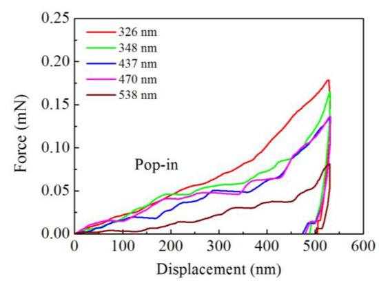 To avoid the substrate effect, the indentation depth should not exceed 10% of the thickness of the samples [33]. In our study, the film thickness was about 10 um and the maximum indentation depth in the tests was set to 550 nm. Thus, the influence of glass substrate on the load-depth curves of the PC thin films was negligible. Figure 3 shows the load-depth curves of five sizes of PC thin films under a maximum indentation depth of 550 nm. Obviously, the loading tracks exhibit a pop-in phenomenon in each curve [35]. Comparing the shape of each curve, there is no pop-in event in the unloading part. It is interesting to find that the curves show a very noticeable size dependence in Figure 4. At the same maximum indentation depth, the load increased significantly as the microsphere size of the PC thin films decreased. Based on the load-depth curves, hardness and Young’s modulus were calculated by applying the Oliver and Pharr method [36]:
