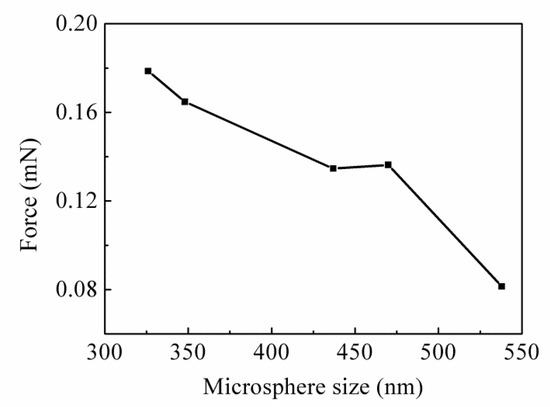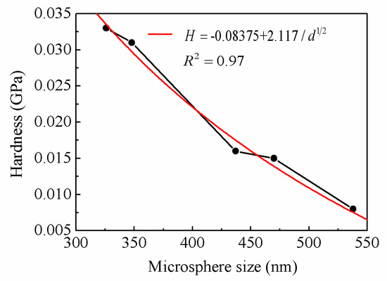 We fit the constant values and by the relationship between hardness and microsphere size. From Figure 6, we can see that the relationship between microsphere size and hardness is similar to the Hall-Petch formula. Our investigation revealed that the trend “smaller is stronger” occurred in silica PCs, similar to the result of Liu [28], which had been extensively reported for crystalline metallic materials [39,40].