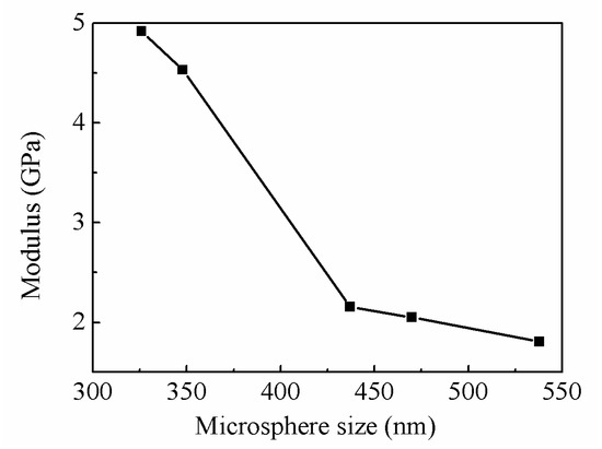 Figure 5 shows the measured Young’s modulus for different PC thin films. The Young’s modulus decreased when the size of the constitutive microspheres increased. The calculated results prove unambiguously that the elastic modulus of PCs is strong and dependent on size, increasing from 1.81 GPa to 4.92 GPa as the diameter decreased from 538 nm to 326 nm. Likewise, hardness demonstrated a similar size-dependent tendency, increasing from 0.008 GPa to 0.033 GPa as the diameter decreased, as shown in Figure 6. The relation between the yield stress and the grain size in the PCs is known as the Hall–Petch relation [37,38]. The empirical Hall–Petch formula states that yield strength increases monotonically with decreased average grain size according to