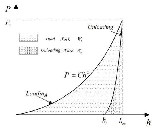 where is the hardness; is the peak load; is the contact depth; is the contact area; is the reduced modulus, ; is a constant related to indenter shape, when using a Berkovich diamond tip; is the curvature of the unloading curve; and are the elastic modulus and Poisson ratio of the samples, ; and and are the elastic modulus and Poisson ratio of the diamond indenter, , .