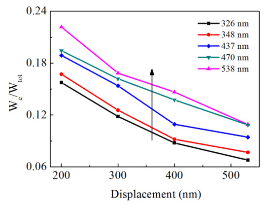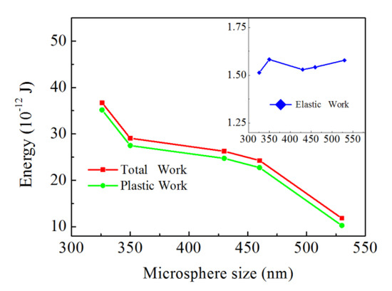 The energy value of Figure 8 is calculated based on the experimental results at the maximum indentation depth, so it cannot reflect the energy change rules of PCs during the entire indentation process. Therefore, in the plastic work and total work, the finite element method (FEM) simulation of PCs is presented to investigate the relations between and among the elastic work (Supplementary Materials). We selected four indentation depths to simulate the indentation process and then calculated the work of each part according to the simulation curves. As shown in Figure 9, total work gradually increased with increased indentation depth in all cases; however, with rising microsphere size, whole work decreased in the same indentation depth. This illustrates that under the same depth of penetration, the energy of resistance to deformation decreased with the increased particle size, resulting in less hardness and smaller elastic modulus. It obviously shows that at a depth of 200 nm the total energy of these five microspheres was below 10 × 10–12 J, between 1.938 × 10–12 J and 5.762 × 10–12 J. However, the work value of the different microsphere sizes began to change significantly with the increase in depth, and this was because the second-stage deformation became the primary factor. From Figure 10, it can be concluded that the proportion of elastic work gradually decreased with the increase of indentation depth, and the ratio was down to less than 10% at the maximum indentation displacement. This indicates that the plastic proportion is more significant due to the second-stage deformation. With the decrease of microsphere size, the proportion of elastic work decreased, so the plasticity ratio increased. Although the areas under the indenter at the same penetration depth were equal, the void ratio changed after the microsphere was broken. The smaller the particle size, the higher the density, with a lower proportion of elastic work. These trends coincide with the two-stage deformation model and the experimental results. Therefore, the simulation results prove the effectiveness of the two-stage deformation model.