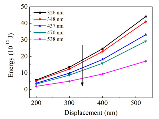 As presented in the previous sections, mechanical properties, including load–depth curves, Young’s modulus, and hardness, were equally size-independent. The mechanical properties of this “granular” material depend on the contacts and adhesion between the particles at nanoscale. However, the silica PCs at submicron level contain specific microstructures, and their mechanical properties are affected by both microsphere size and microstructures. Furthermore, the synthesis of these silica PCs has the same porosities intended to be kept as constant (0.26) because of the FCC structure [41], which indicates that the mechanical properties of silica PCs are mainly affected by the variations of particle size and the intrinsic mechanical parameters of microspheres. However, the deformation under the tip is a complex nonlinear process, including elastic and multiple plastic deformations. In order to explore its mechanism, we studied the total work and plastic work in the progressive failure of silica PCs. The area under the loading curve gives the total work , as shown in Figure 7; the reversible elastic work can be deduced from the area under the unloading curve [42]. The energy absorbed by plastic deformation is the difference between these: