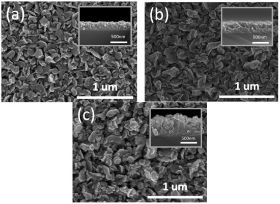 SEM images of the sample surface (a) ST1; (b) ST2; and (c) ST3. The cross-section is shown in the inset.