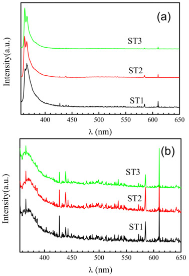 Photoluminescence spectra of samples ST1, ST2, and ST3 measured at (a) 10 K and (b) room temperature.