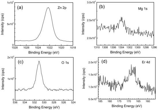 Figure 4 exhibits the XPS spectra of Zn 2p, Mg 1s, O 1s, and Er 4d in the MgZnO:Er layer of sample ST3. In Figure 4a, the Zn 2p3/2 signal with a peak energy of 1022 eV can be observed. The value is within the reported range for high-temperature annealed ZnO [44]. A distorted profile toward the high-energy side of Figure 4a can be observed. This is ascribed to Zn2+ in hydroxide [45], and originates in the spray pyrolysis process. In Figure 4b, the binding energy, 1304 eV, of the Mg 1s core level is observed [46]. In Figure 4c, the O1s signal with a peak energy of 531 eV was observed. This value is near the reported O2− on a normal wurtzite ZnO crystal (530.8 eV) [44,47]. The distorted shape in the high-energy side shows O2− in hydroxide [48]. Figure 4d shows the Er 4d5/2 signal. This broad profile may include the signal related to Er‒OH bonds (peak energy at 170.4 eV) and the signal related to Er‒O bonds (peak energy at 168.4 eV) [46]. The Er/Zn ratio in the film is estimated be 0.2% from the XPS characterization. As the atomic ratio of Er/Zn is 5% in the precursor, the incorporation efficiency of Er from ErAc is low compared to that of Zn from ZnAc in the spray pyrolysis deposition process.