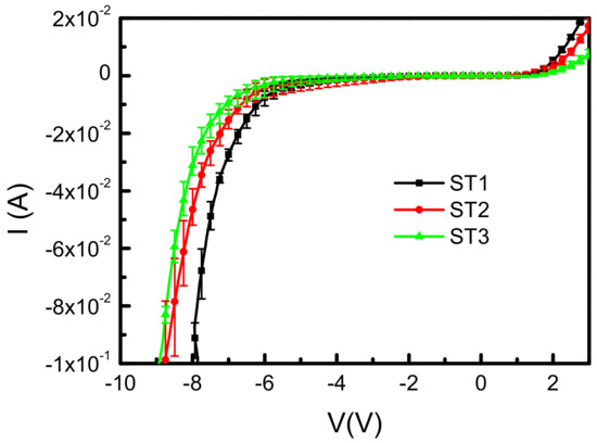Current‒voltage (I‒V) characteristics of samples ST1, ST2, and ST3 measured at room temperature.
