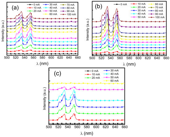 The electroluminescence spectra of samples (a) ST1; (b) ST2; and (c) ST3 measured at room temperature with different injection currents measured at room temperature.