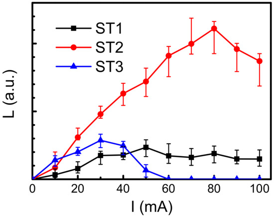 The light intensity‒current (L‒I) characteristics of samples ST1, ST2, and ST3 measured at room temperature.