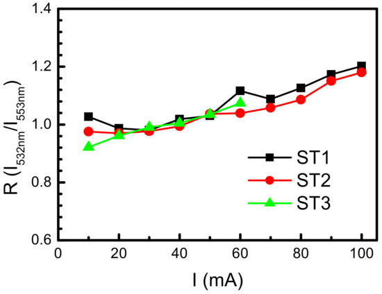 The electroluminescence intensity ratio R(I532 nm/I553 nm) of samples ST1, ST2, and ST3 measured at room temperature with different injection current I.