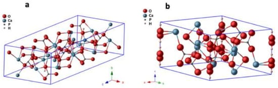 Although the structural differences between monoclinic and hexagonal HA are very small, they are sufficient to exert a substantial impact on some of their physicochemical properties [9,10,11]. The novel medical rehabilitation therapies of bones require smart biomaterials, particularly the piezoelectric ones because they are mechanical–electrical transductors. Figure 1 shows the unit cells of both phases of HA, as an arrangement of PO4 tetrahedral units bound by Ca ions [11].