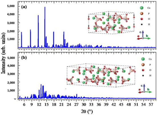 Calculated powder diffraction pattern using X-ray wavelength of 0.7 Å. (a) Hexagonal phase (space group176, P63/m) and (b) monoclinic phase (space group 14, P21/b). Crystallographic information for (a,b) are respectively from References [24,25]. Structural models are shown in the insets.