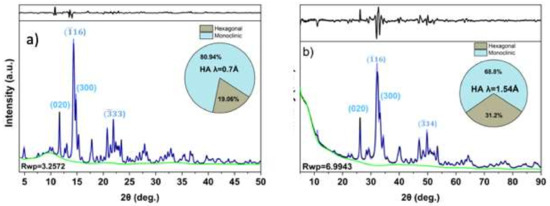 (a) Room temperature XRD pattern of HA powder sample collected with λ = 0.7 Å (synchrotron radiation); (b) Cu Kα (λ = 1.54 Å) patterns. In case of the SR data, there is a better signal to noise ratio and a larger reciprocal space coverage which permits more reliable phase fraction analysis from a Rietveld refinement analysis.