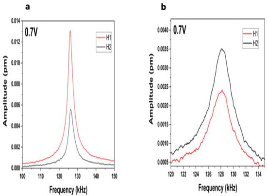 In recent years, resonant PFM has become the widely used technique for the characterization of local piezo-ferroelectric properties in several materials. However, some PFM artifacts can affect the signal obtained during the PFM measurements. There are different sources of these artifacts, including electrostatic forces and electrostriction [26,27]. Some strategies have been developed in order to identify and avoid these artifacts in PFM. One of these strategies was reported by Yuan et al. [28]. This consisted of comparing the first and second harmonic to obtain the electrostriction signal and the piezoelectric contributions. In order to obtain quality PFM measurements, we required the first harmonic to be higher than the second. Measures of the first and second harmonic are shown in Figure 4. Here we can see that the first harmonic is certainly higher than the second, confirming, therefore, that the signal measured was due to the piezoelectric properties of hydroxyapatite. Nonetheless, according to Reference [29], the difference in the phases for piezo-ferroelectric materials needs to be approximately 90°. These measurements agree with the literature recently published [29].