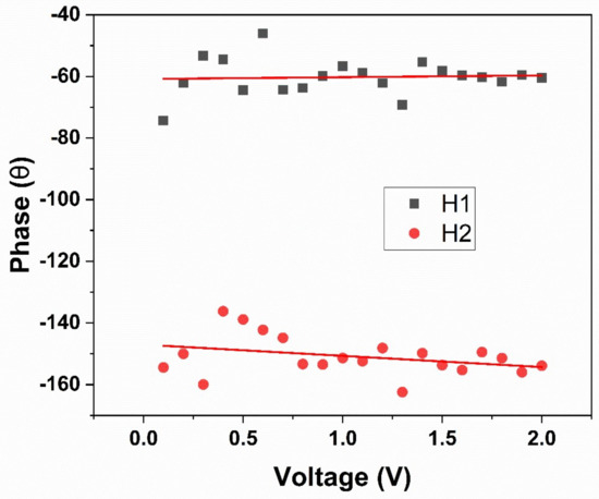 Corresponding phase values for the voltage sweeps of the first and second harmonics of the PFM tip, where the difference of 90 degrees between the two phases can be seen.