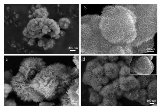 In order to explore the morphological evolution of anatase TiO2 with flower-like nanostructures by our prepared methods. We conducted a series of exploratory experiments based on time changes and keeping other conditions constant. The SEM images of TiO2 nanostructures synthesized with different hydrothermal times were shown in Figure 2. As shown in Figure 2a, only some irregular nanoparticles are gathered together when the reaction time was 0.5 h. Subsequently, many nano-spheres with a rough surface appeared. When the reaction time reached 2 h, the rough sphere surface indicated that the thorn-like structures appear firstly (Figure 2b). With time prolonged, the thorn structures gradually grown into nanosheets and they still maintained the spherical morphology in Figure 2c and this unique flower-like structure was assembled from nanosheets. In addition, the sample with 10 h hydrothermal reaction time was illustrated in Figure 2d. We can clearly see that the 3D flower-like nanostructures are completely formed. The size of the flower-like TiO2 structure is about 600–800 nm. In particular, the nanosheets are relatively thicker and more compact than the sample with 6 h reaction time. The results correspond to our previous XRD characterization (Figure 1).