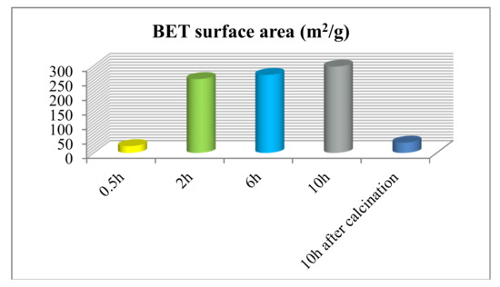 The surface area of the different TiO2 products: 0.5 h; 2 h; 6 h; 10 h; 10 h after calcination.