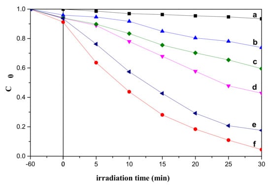 From Figure 7 we get the pseudo-first-rate order kinetic curves, ln(C0/C) = kt, for the photocatalytic degradation kinetic reaction [39]. According to the formula of pseudo-first-rate, k and t denote the pseudo-first-rate kinetic constant and irradiation time. The corresponding apparent degradation rate constant for sample are (b) 0.0085 min−1, (c) 0.0168 min−1, (d) is 0.0291 min−1 and (f) 0.0717 min−1 by calculating, and the flower-like TiO2 with 10 h reaction time (e) is 0.1133 min−1, which is significantly higher than other as-prepared samples. It further confirmed that the TiO2 with flower-like nanostructures exhibit more excellent photocatalytic efficiency than other samples. This is attributed to the flower-like TiO2 having higher specific surface area than other samples (Figure 4). Additionally, the unique nanostructure could provide more active catalytic sites [40,41]. Flower-like TiO2 also showed good crystallinity (Figure 1d), and its photocatalytic property was related to the crystallinity of anatase. We also found that the sample after calcination showed significant photocatalytic activity, but it was slightly lower than the sample with 10 h reaction time. It further demonstrated that photocatalytic performance is not only related to the specific surface area of the samples, but also to the crystallinity of the samples.