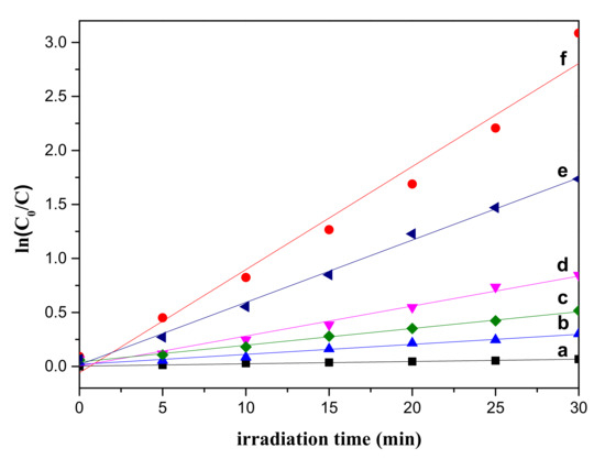 Linear fit between ln(C0/C) and time of photocatalysis degradation of MB solution by using different catalysts: (a) without catalyst; (b) 0.5 h; (c) 2 h; (d) 6 h; (e) 10 h after calcination; (f) 10 h.