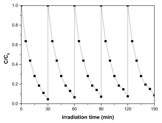 Cycling degradation MB of flower-like TiO2 with 10 h reaction time under the UV-vis light irradiation.