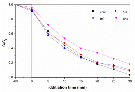 To further explore the role of active species in the reaction process, a set of radical trapping experiments were carried out. From Figure 9, we can clearly observe the distinct decrease in photodegradation rate in the presence of IPA. The photocatalytic degradation rates of flower-like TiO2 are almost identical whether BQ or AO was present or not. Therefore, we can confirm that ·OH contributes the most to photocatalytic activity of flower-like TiO2.