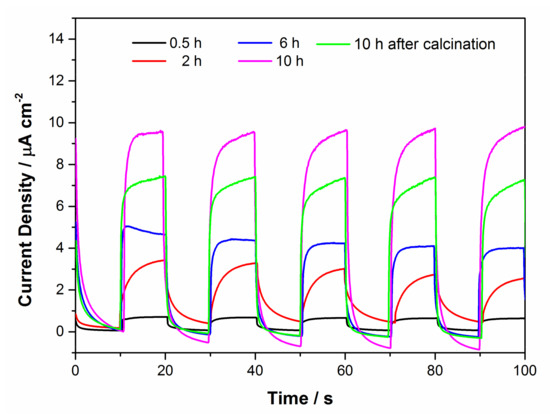 From Figure 10, we can observe the photocurrent response of TiO2 prepared under different reaction conditions. All samples except the calcined sample showed an enhanced photocurrent densities as the hydrothermal reaction time increased. As we all know, the larger the specific surface area, the more favorable the propagation and scattering of incident light, thereby improving the absorption and utilization of light. The thinner nanosheets facilitated the separation of photogenerated electrons and holes, so flower-like TiO2 exhibited excellent electrochemical property. In particular, the photocurrent density of the calcined sample was only lower than that of the sample with 10 h reaction time, higher than the other samples. The high crystallinity is advantageous for the transport of charge. These results were in accordance with their photocatalytic activities, respectively.