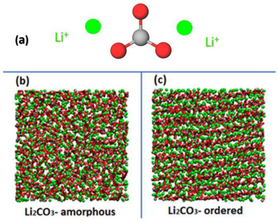 Understanding correlations between the underlying molecular structure and Li+ ion transport in Li2CO3 solid phases can provide an important molecular scale insight helping in the design of more efficient solid electrolytes and SEIs. So far, there have only been a few theoretical studies of Li2CO3, most of which focused on the crystalline phase. Shi et al. used Density Functional Theory (DFT) calculations to compute defect thermodynamics associated with Li ion in monoclinic Li2CO3 system and analyzed diffusion of charge carriers at different voltages. They reported a possible diffusion mechanism for Li+ and its vacancies and suggested that the Li+ ion transport in crystalline Li2CO3 can be increased by increasing diffusion carriers’ concentration. According to this study, as the diffusion carriers’ concentration strongly depends on voltage, using different dopants for electrode materials may improve Li+ conductivity through Li2CO3 [1]. In another study done by Shang et al., where lattice dynamics and elastic properties of monoclinic Li2CO3 have been studied using DFT calculations, it was suggested that the reason why Li+ can easily diffuse in Li2CO3 is due to the weak bonding between Li+ and other atoms [18].
