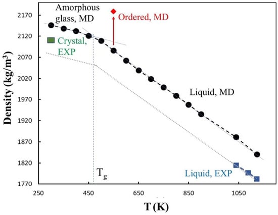 Figure 2 shows the resulting temperature dependence of average (over 10 independent systems) density for the amorphous phase as obtained from MD simulations. At 550 K, we report two density values: one averaged from systems that remained amorphous during entire simulation and another from two systems that showed an apparent crystallization/ordering. These simulations were conducted in a conventional cubic simulation cell and therefore systems that crystallized would not be able to form the expected monoclinic structure in the entire system. Instead, a somewhat frustrated ordered phase with an average density of 2.5% higher than amorphous phase was formed, as illustrated in Figure 1c. In the amorphous liquid phase (>500 K), the density dependence is almost linear and in agreement (within 2%) with available experimental data above 1000 K [27,28]. However, as the temperature decreases (below 500 K), we observe a change in the slope (decreasing) for the density-temperature dependence. Such behavior is consistent with the glass transition of the amorphous phase with an approximate glass transition temperature (Tg) of 470 K. Moreover, at 300 K, the density of glassy state predicted by MD simulations is about 1% denser than the reported experimental value for the crystal phase [29]. However, this is consistent with the systematic overestimation of density from simulations seen at higher temperatures. If one assumes the same temperature dependence for amorphous phase as obtained from simulations for experimental data, then expected glassy density would be about 1% lower than in the crystal (see dotted line extrapolating experimental liquid densities to lower temperatures in Figure 2).