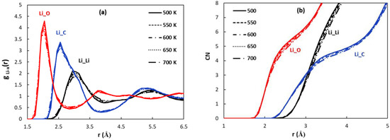 Next, we analyzed the Li+ cation coordination by calculating the radial distribution functions ((g(r)) at temperatures ranging between 500 and 700 K. Figure 3a shows Li+ and carbonate oxygen and carbon atoms of CO32− correlations. There was a sharp peak at about 2.0 Å in the gLi−O(r), showing a strong preference for the Li-O interaction, which was expected because of a relatively high negative partial charge (~–0.85) on carbonate oxygen atoms. The minimum of the mentioned peak (2.8 Å) was used to define the first coordination shell of Li+. The Li−Li pair correlation shows a peak at 3 Å. The values of the g(r) peaks and their location for Li-Li, Li-O, and Li-C g(r)s agree with previous works [30,31,32]. The g(r)s obtained at various temperatures indicate that the pair correlations are unaffected by the temperature, showing that the local coordination of a Li+ is mostly independent of temperature. Figure 3b shows the corresponding coordination numbers.