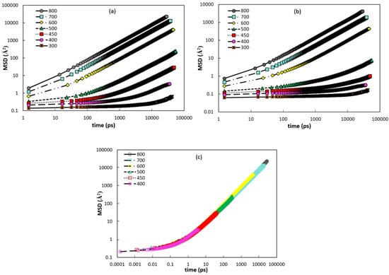 This approach is illustrated in Figure 4c where each MSD(t) curve from Figure 4a was shifted along the time axis to match the MSD = 1 Å2 value at T = 800 K. As can be seen, the assumed time−temperature superposition principle works very well in this system.