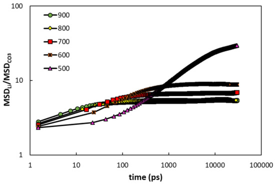 The examination of the MSD ratio of cation and anion in the amorphous systems (Figure 5) shows that at high temperatures (>600) the ratio saturates around factor of 8–9 at long-times, indicating a constant scaling factor of Li mobility versus anion mobility in the liquid phase. As the temperature decreases further, we can see that the long-time ratio increases indicating further separation between Li+ and CO32− mobilities.