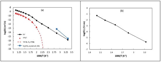(a) Diffusion coefficients of anion and cation and (b) ionic conductivity of Li. in Li2CO3 as a function of inverse temperature as obtained from MD simulations. Also shown are the data from atomistic MD simulations of crystalline Li2CO3 from ref. [32].