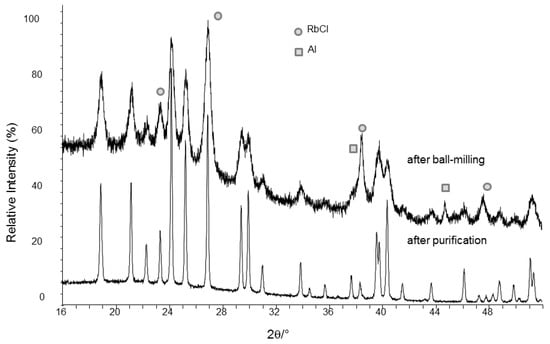 PXD patterns of RbAlH4 obtained by direct synthesis from Rb and Al metals according to Scheme 4 obtained directly after ball-milling and after purification. Data were collected on a laboratory instrument with CuKα1 radiation (1.54056 Å).