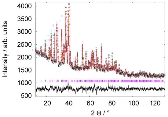 - Larson, A.; Von Dreele, R. GSAS, Report LAUR 86-748; Los Alamos National Laboratory: Los Alamos, NM, USA, 2004. [Google Scholar]