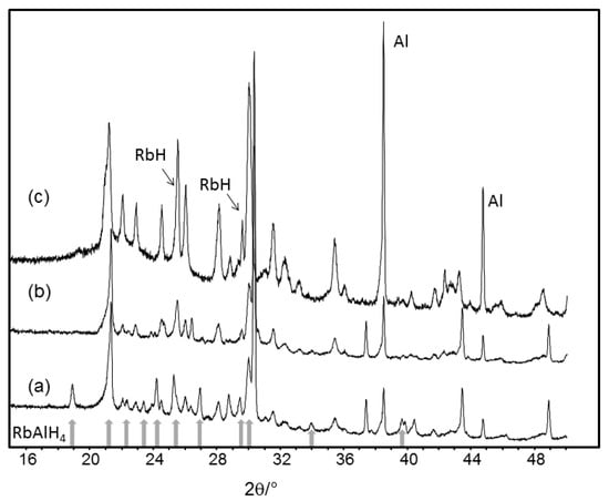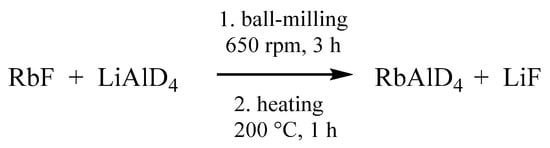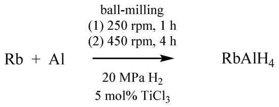 Rubidium is a very soft and ductile material. Starting from the pure metals Rb and Al, direct synthesis must be performed in several steps. The hydrogenation of Rb to RbH under mechanochemical conditions was performed at low revolutions per minute (250 rpm). Otherwise, the metal is smeared over the wall of the milling vial and no complete hydrogenation can be observed [19]. In the next step, the mechanochemically induced hydrogenation of the RbH-Al mixture can be done with 450 rpm to produce RbAlH4 by ball-milling under 20 MPa H2 pressure for 5 h according to Scheme 4. However, this synthesis requires the addition of 5 mol% TiCl3 for a successful synthesis.