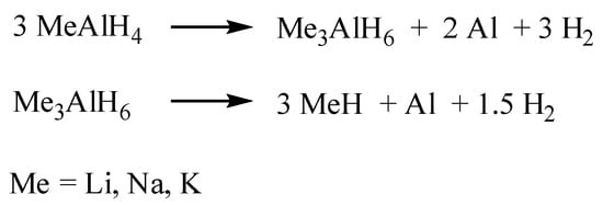- Bastide, J.P.; El Hajri, J.; Claudy, P.; El Hajbi, A. A new route to alkali metal aluminum hydrides MAlH4 with M = Na, K, Rb, Cs and structural features for the whole family with M = Li to Cs. Synth. React. Inorg. Met. Org. Chem. 1995, 25, 1037–1047. [Google Scholar] [CrossRef]
