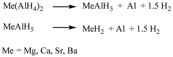 - Pommerin, A.; Wosylus, A.; Felderhoff, M.; Schüth, F.; Weidenthaler, C. Synthesis, crystal structures, and hydrogen-storage properties of Eu(AlH4)2 and Sr(AlH4)2 and of their decomposition intermediates, EuAlH5 and SrAlH5. Inorg. Chem. 2012, 51, 4143–4150. [Google Scholar] [CrossRef] [PubMed]