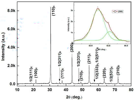 A photograph of the obtained PLN-0.07PT crystal is shown in Figure 1. The external macro structure of the crystal is a tetrakaidecahedron combination with pseudocubic (100) and (111) planes in habit, and the crystal is a light yellow color. The dimensions of the largest single crystal block generally reach 9 × 15 × 13 mm3 in size. At room temperature, the X-ray diffraction pattern of PLN-0.07PT exhibits a typical perovskite structure as shown in Figure 2. In addition, some super-lattice reflections, which originate from long-range ordering of B-site cations, can also be seen. The presence of a super-lattice reflection suggests that the prototypical crystal structure is an ordered perovskite with an effective unit cell that is (2ac × 2ac × 2ac) doubled in size in all crystallographic axis directions of a cubic, simple perovskite cell (ac × ac × ac). Here, the subscript “c” refers to the cubic perovskite basis cell [4]. PLN-0.07PT exhibits a number of super-lattice peaks, with some of the obvious peaks corresponding to d-spacing values twice as much as those of (111)C, (311)C, (331)C, (333)C, (511)C, and (531)C, while major ones can be indexed as 1/2(111)C, 1/2(311)C, 1/2(331)C, 1/2(333)C, 1/2(511)C, and 1/2(531)C, respectively, showing the good-order feature of a single crystal. Special attention was focused on the (200)C peak. It is known that the XRD profiles of (200)C reflections in the orthorhombic (O) phase would split into three peaks: the O(200), O(020), and O(002) profiles [17]. The O(002) and O(020) peaks are so closed that the intensity of the O(002)/(020) peak is twice as that of the O(200) peak. As evidenced from the split in the fundamental lines around 2θ ≈ 43.4–44.0° at room temperature, shown in the insets of Figure 2, the lattice distortion is found to be orthorhombic in nature.