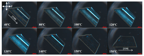 The macro-domain structures of the [111]-oriented plate of the PLN-0.07PT crystals were investigated under a crossed polarized light microscope as shown in Figure 4. The domains appear to be in extinction or full bright locally based on the direction of polarization and the polarizer. As shown in Figure 4, the domains appear to be in extinction when θ = 0° (θ is defined as the smaller angle between the [110] crystallographic axis and the polarizer), while the field manifests full bright when the objective table was rotated 45°, further confirming the orthorhombic symmetry of the PLN-0.07PT crystal at room temperature. The evolution of the domain is studied under a crossed polarized light microscope by heating from room temperature to 150 °C as shown in Figure 5. Few changes are observed below 130 °C. By continuous heating, some bright parts of the domains started to disappear until they disappeared completely at 150 °C. It is indicated that a phase transition of the crystal occurred between 130 °C and 140 °C, which will be discussed hereafter.